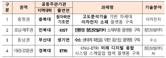 충청권, 호남·제주권, 동남권, 대경·강원권에서 각각 이차전지, 첨단모빌리티, 수소, 인공지능(AI) 등 핵심 기술 분야의 플랫폼을 운영한다.